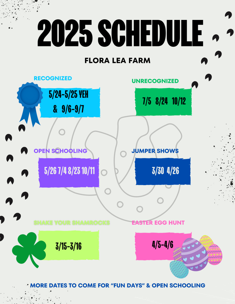 We want to see your photos! Share your schooling and farm photos with the hashtag #floraleafarm. Instagram: @floraleafarm Facebook: Flora Lea Farm LLC