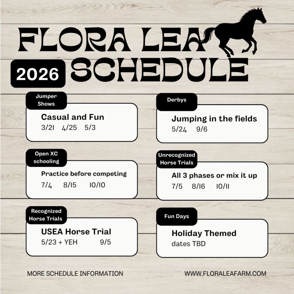 We want to see your photos! Share your schooling and farm photos with the hashtag #floraleafarm. Instagram: @floraleafarm Facebook: Flora Lea Farm LLC